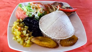 Casado típico – beans, rice under a tortilla “lid”, fried plantain, boiled yuca, salad and meat